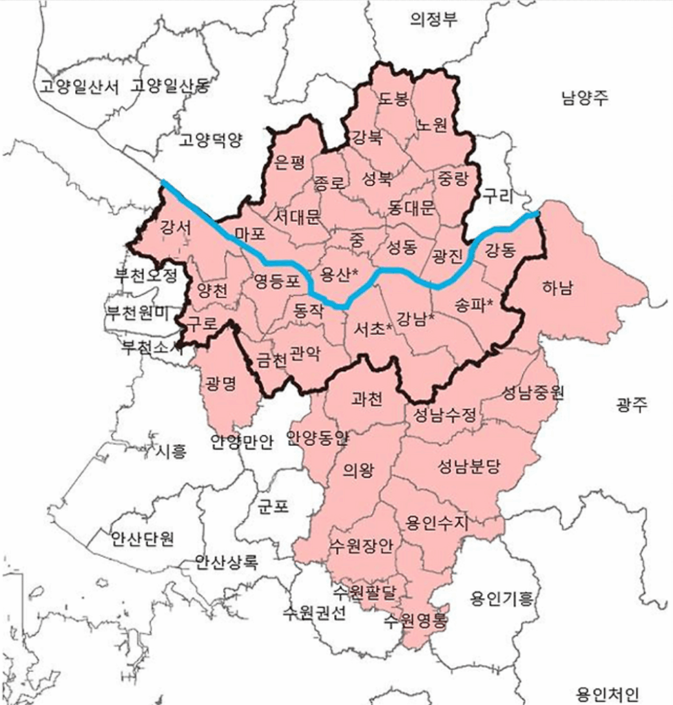 우선 본인이 보유하거나 보유할 예정인 아파트가 위에 해당한다면 토지거래허가구역이라 보시면 됩니다. 기존 서초,강남,용산, 송파의 별 부분의 토지거래허가구역이 빨간색 부분으로 확대되었음을 알려드립니다.